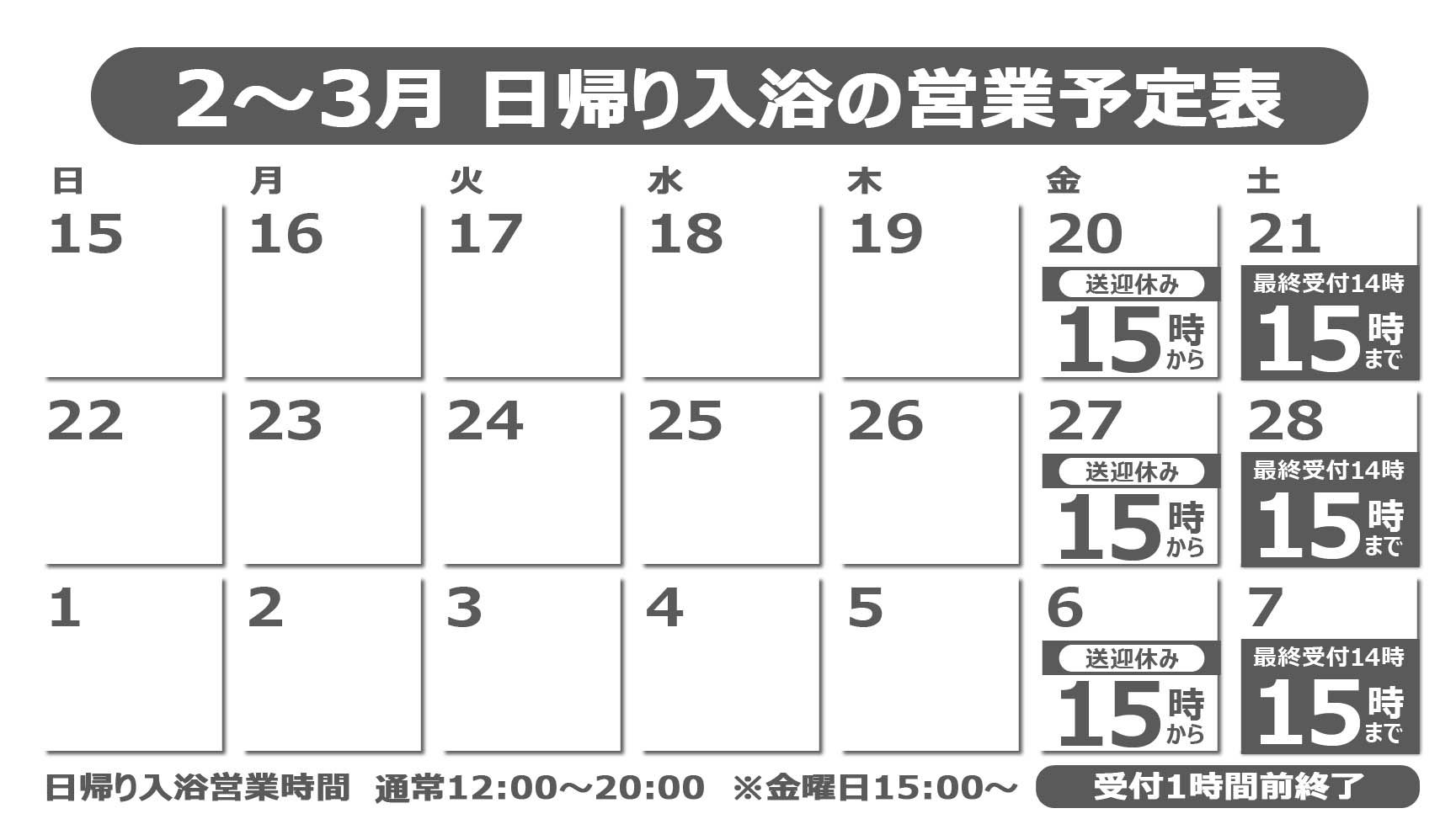 2月21日㈯は、15:00まで